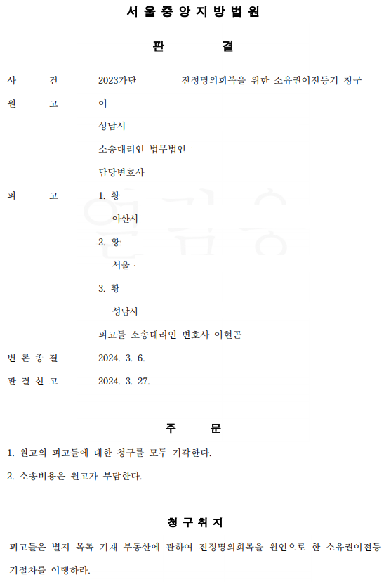 목록 게시판 옵션 검색 상속 진정명의회복을 위한 소유권이전등기 사건-상속재산 관련 페이지 정보 작성자 최고관리자 조회 59회 작성일 2025.08.18 본문 원고는 자신의 명의였던 부동산을 망인에게 명의신탁한 것이라는 이유로 피고들이 망인으로부터 상속받은 부동산에 대하여 소유권이전등기를 청구하였으나, 새올 법률사무소가 원고 청구에 대하여 기각 판결을 받아준 사례 이전글 상속재산분할 및 기여분 사건 25.08.18 목록 다음글 소유권이전등기 사건-상속재산 관련 25.08.18