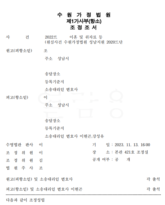 원고는 유책배우자인 피고에게 위자료 2,000만 원과 재산분할로 부동산의 소유권이전등기와 금 약 3여억 원을 청구하였고, 제1심에서 원고가 승소하였으나, 항소심에서는 새올 법률사무소가 부동산에 대해서만 소유권이전등기를 해주고 나머지 재산에 대해서는 각자 귀속하는 것으로 조정성립을 시켜준 사례