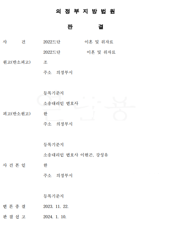 목록 게시판 옵션 검색 이혼 이혼 및 위자료 사건 페이지 정보 작성자 최고관리자 조회 189회 작성일 2025.04.27 본문 원고가 유책배우자인 피고에게 위자료로 5,000만 원을, 재산분할금 약 1억 5천 7백여만 원을 청구하였으나, 새올 법률사무소가 위자료는 1,200만 원으로, 재산분할금은 7,630여만 원으로 감액하여 판결을 받아준 사례 이전글 이혼 사건 25.04.27 목록 다음글 혼인의 무효 사건 25.04.27