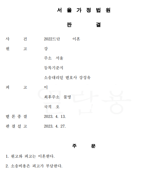 목록 게시판 옵션 검색 이혼 이혼 사건 페이지 정보 작성자 최고관리자 조회 206회 작성일 2025.04.27 본문 원고와 피고는 호주에서 혼인하였으나 피고의 가정폭력과 마약 등의 범죄행위로 인해 별거 후 국내에 입국하여 이혼을 희망하였고, 새올 법률사무소가 이혼 판결을 받아준 사례 이전글 이혼 등 사건 25.04.27 목록 다음글 이혼 및 위자료 사건 25.04.27