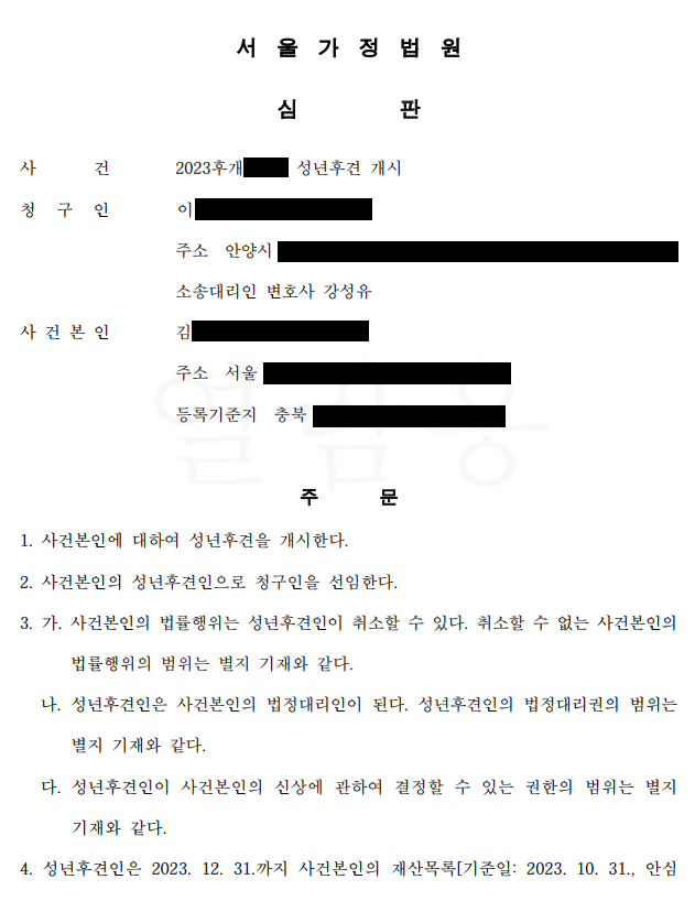 목록 후견 성년후견개시 사건 페이지 정보 작성자 최고관리자 조회 93회 작성일 2025.08.18 본문 사건본인(피성년후견인)은 1938년생 여성이었고, 당시 알츠하이머형의 노년성 치매 등 지병을 앓고 있었으며, 새올 법률사무소가 사건본인에 대해 성년후견개시 심판을 받아준 사례 이전글 성년후견개시 사건 25.08.18 목록 다음글 성년후견개시 사건 25.08.18
