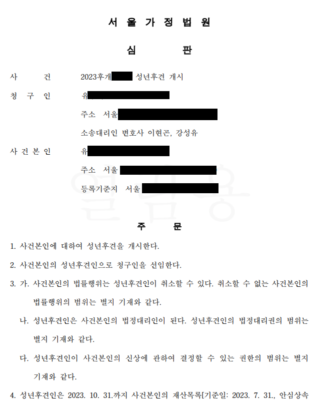 목록 후견 성년후견개시 사건 페이지 정보 작성자 최고관리자 조회 71회 작성일 2025.08.18 본문 사건본인(피성년후견인)은 1940년생 남성이었고, 당시 중증 알츠하이머성 치매 등 지병을 앓고 있었으며, 새올 법률사무소가 사건본인에 대해 성년후견개시 심판을 받아준 사례 이전글 성년후견개시 사건 25.08.18 목록 다음글 성년후견개시 사건 25.08.18
