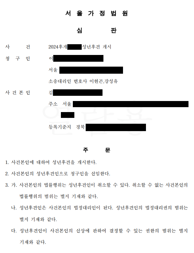 목록 후견 성년후견개시 사건 페이지 정보 작성자 최고관리자 조회 78회 작성일 2025.08.18 본문 사건본인(피성년후견인)은 1942년생 여성이었고, 과거부터 상당기간 동안 조현병을 앓으면서 사무처리 능력이 지속적으로 결여된 상태였으며, 새올 법률사무소가 사건본인에 대해 성년후견개시 심판을 받아준 사례 이전글 성년후견개시 사건 25.08.18 목록 다음글 성년후견개시 사건 25.08.18