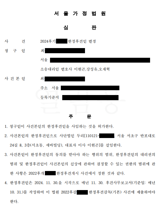 사건본인은 청구인(당시 후견인)의 통제를 벗어나 무분별하게 재산을 처분하는 상황이었으며, 추후에 발생할 문제를 방지하고자 새올 법률사무소를 통해 ‘후견인’을 새올 법률사무소가 별도로 운영하고 있는 ‘사단법인 두리’로 지정 및 변경하는 ‘후견인 변경 심판’을 받아준 사례