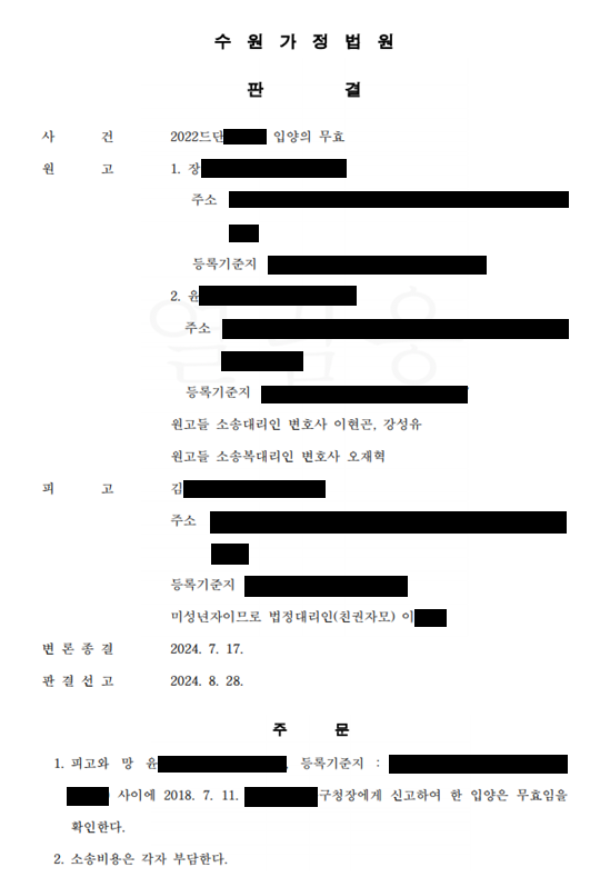 목록 가사 입양의 무효 사건 페이지 정보 작성자 최고관리자 조회 162회 작성일 2025.08.18 본문 ‘계곡살인사건’의 가해자에 의해 그 자녀가 피해자와 일면식도 없음에도 피해자의 호적에 강제로 입적(입양)되었고, 새올 법률사무소가 입양의 무효 심판을 받아준 사례 이전글 자녀 성본 변경 사건 25.08.18 목록 다음글 후견인 변경 심판 25.08.18